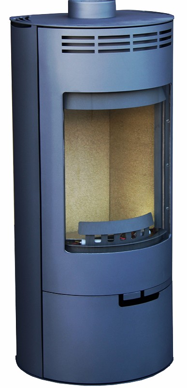 Rohová, kulatá sloupová krbová kamna s průměrným výkonem 7,5 kW, rozsahem výkonů 3,8 až 11,2 kW, účinnost 80%.