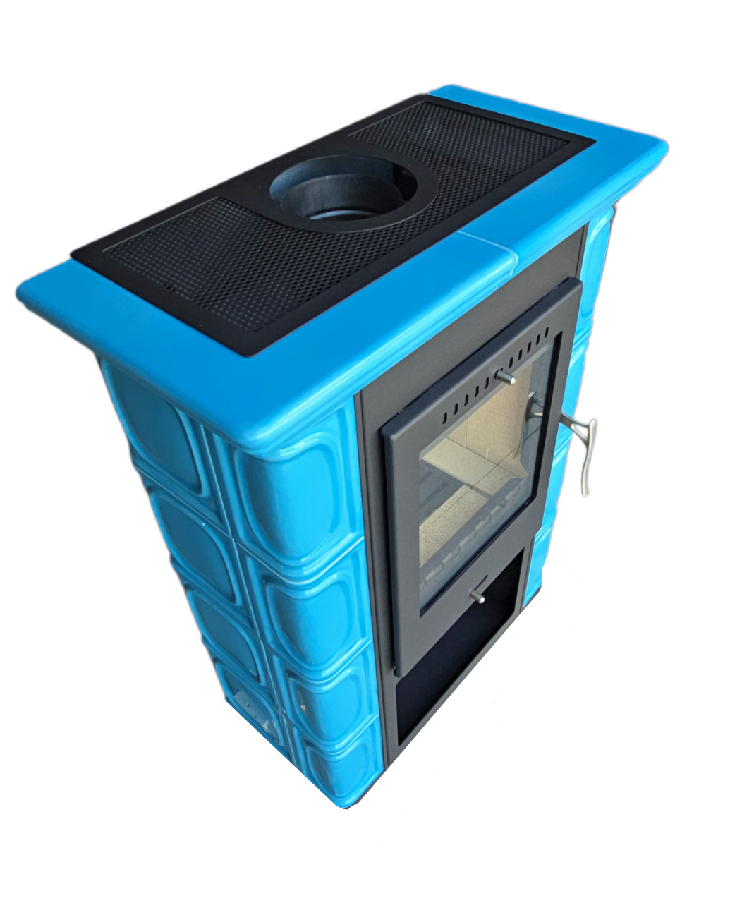 Estetické provedení – leštěné modré kachle („nebeská modrá“) působí dekorativně a mohou být výrazným architektonickým/prvkám interiéru. Kachle jsou ručně vyráběné, takže každé kamna jsou v určitým směru originál.