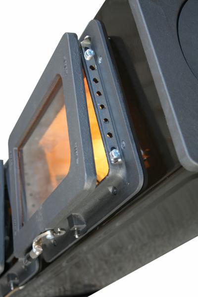 To zajišťuje správné dávkování vzduchu pro spalování a tedy není nutná komínová klapka. Zavírání dveří je bezhlučné.