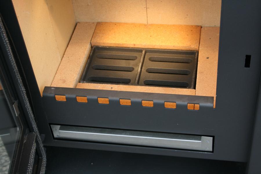 prostoru je litinový rošt a pod roštěm popelník. Přikládací dveře jsou utěsněné a jsou samouzavíratelné. Zavírání je bezhlučné.