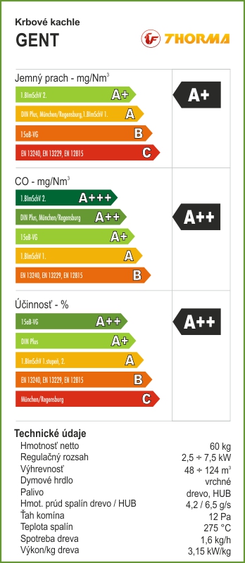 Krbová kamna THORMA GENT černá mají jmenovitý výkon 5 kW, regulovatelný v rozmezí 2,5 až 7,5 kW.