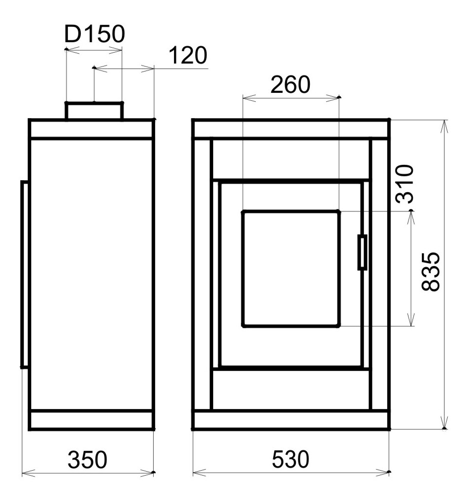 Vývod kouřovodu DN150 pro připojení ke komínu je horní.