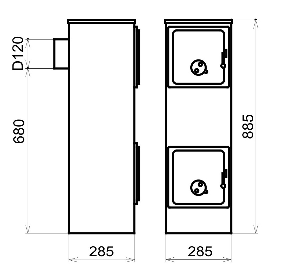 Vývod kouřovodu je zezadu pro kouřovod o průměru D120. Přikládací dvířka a dvířka popelníku jsou těsněná sklotextilní šńůrou. Na obou dvířkách je klapka