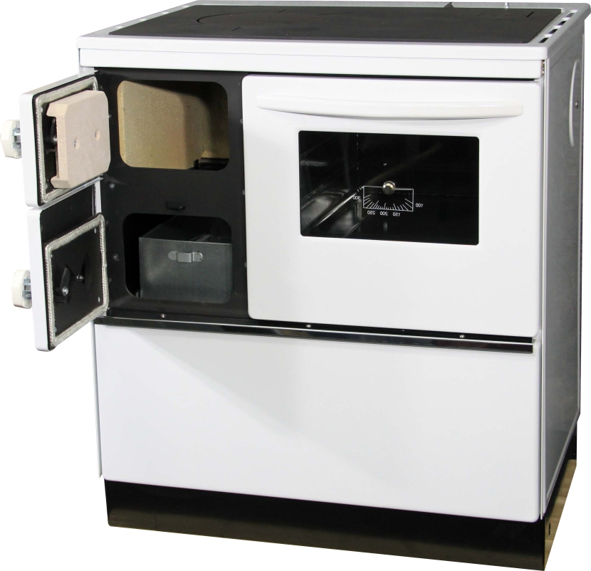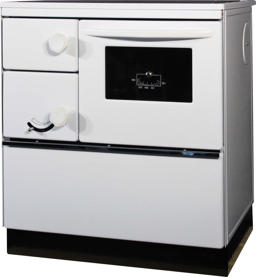 Sporák na tuhá paliva Thorma OKONOM 75 FIKO De Luxe bílý pravý, sporák na dřevo v bílém smaltu, výkon 3,5 až 10,5kW (průměrný 7 kW), účinnost 75%, kouřovod DN120 - doboku, dozadu, nahoru, trouba na pečení, doprava zdarma