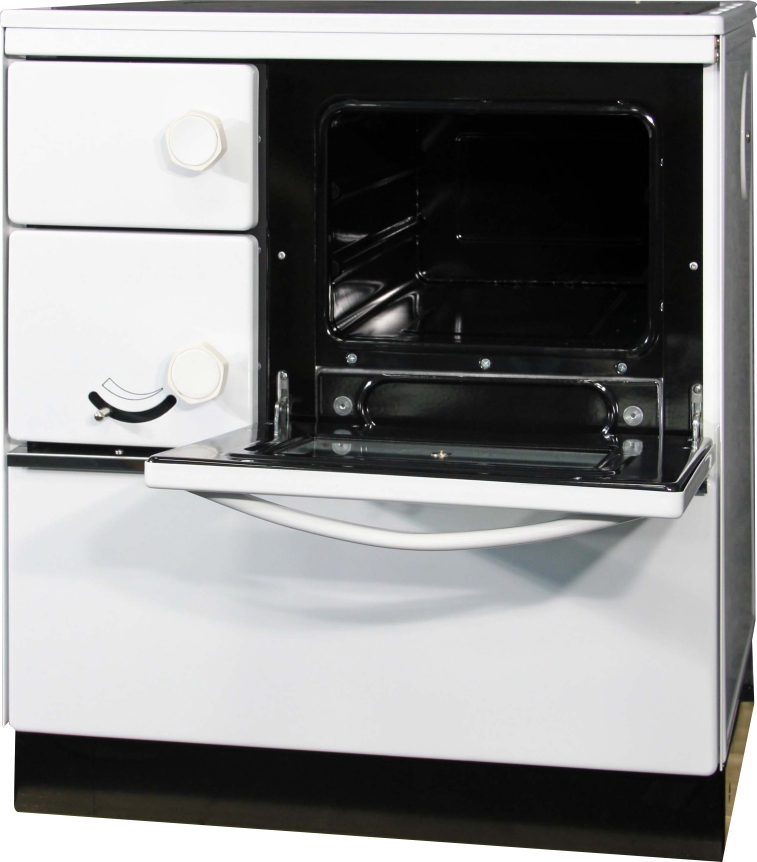 ocelovými pružinami. Pod troubou je otvor na čištění spodní části sporáku, který je zakrytý smaltovaným víkem.