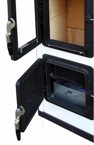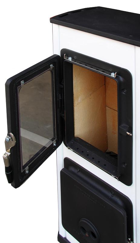 Přikládací a popelníkové dveře jsou z velmi odolné litiny, upravené odolnou barvou proti teplu a otěru.