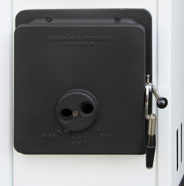 Přiklápěcí plotýnka uzavírá otvory druhého pláště a prodlužuje dobu hoření, kamna předávají teplo okolí sáláním. tento způsob topení stabilizuje topení.
